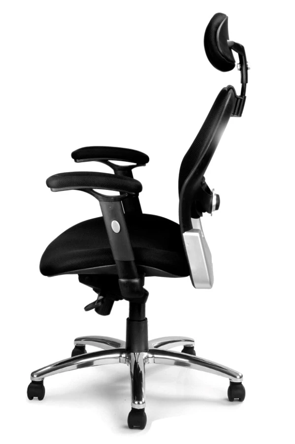 An ergonomically designed high-back executive office chair with an adjustable headrest and adjustable lumbar support, this chair also incorporates a heavy-duty gas lift and is certified for 24-hour usage.