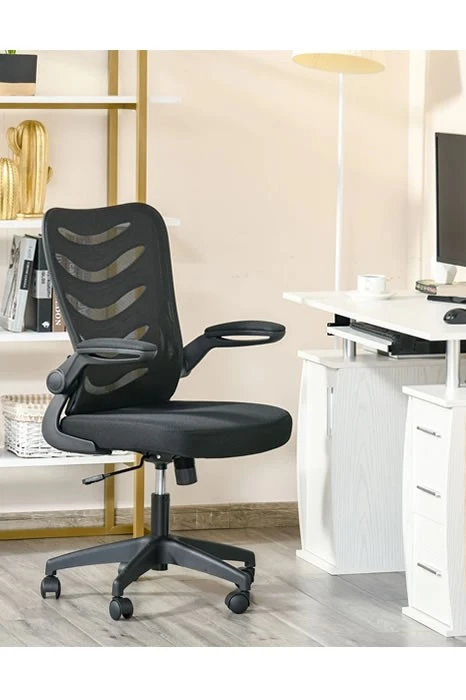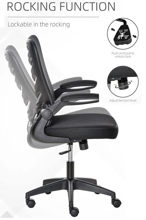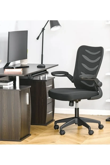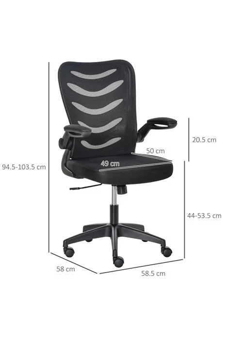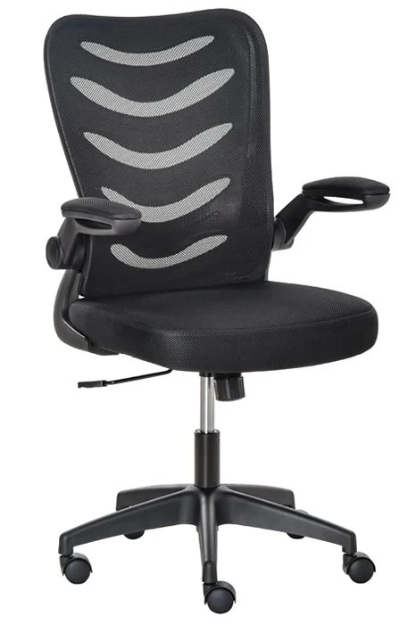 The Alaska high back mesh executive operator’s chair has breathable black mesh upholstery. The arms easily flip up to fold out of the way. The chair has a tilt reclining mechanism lockable in an upright position.