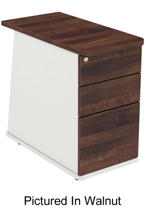 The Ascend Desk High Three Drawer Pedestal has a sleek and elegant A frame leg design that is angled at 100 degrees. The leg is powder coated in a crisp white finish and has self-levelling feet for stability. The pedestal has three drawers that are fully assembled and lockable, with two keys provided. The drawers are available in white with a choice of wood finish and drawer fronts, except the desk high units which also have matching top and drawer fronts.