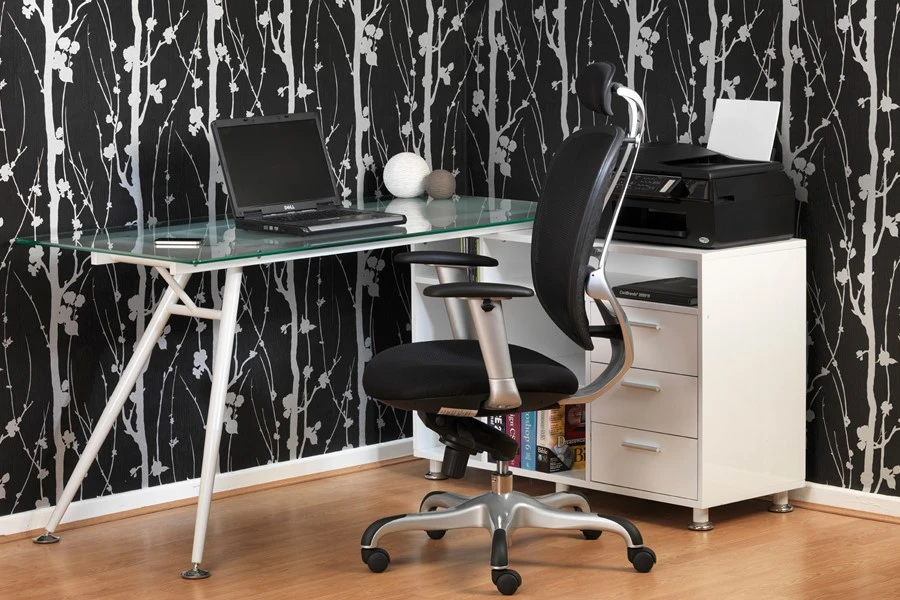 The August features a stunning frosted glass work top perpendicular to a white PVC storage pedestal, complete with 3 drawers and 5 additional storage compartments. The satin handles and feet perfectly complement the brilliant white desk, and are adjustable to give a level work surface.