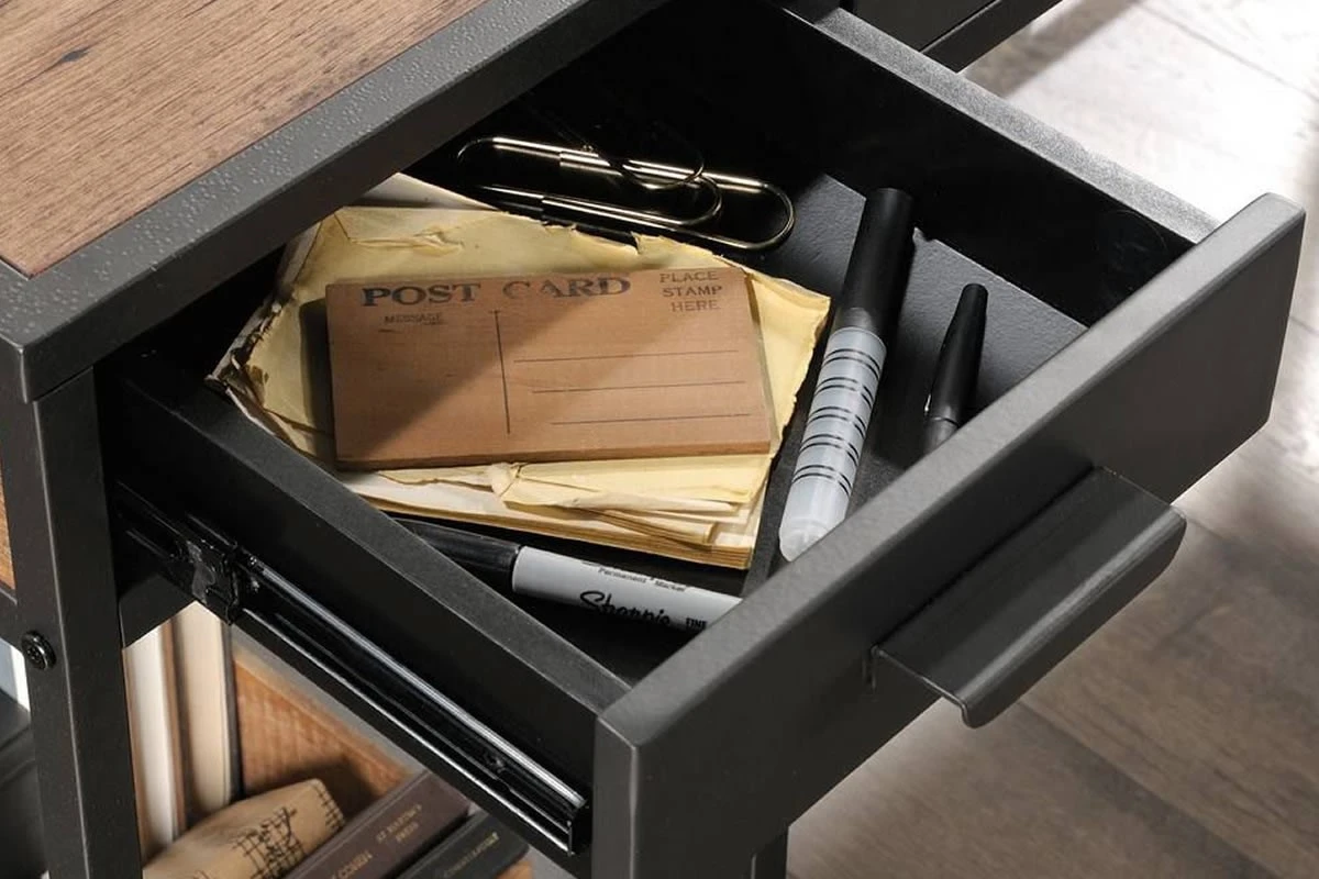 There are two storage drawers with full extension slides to stash all manner of desking stationery as well as an adjustable shelf discreetly hidden behind a metal door with a wire mesh front, all finished in sleek black.