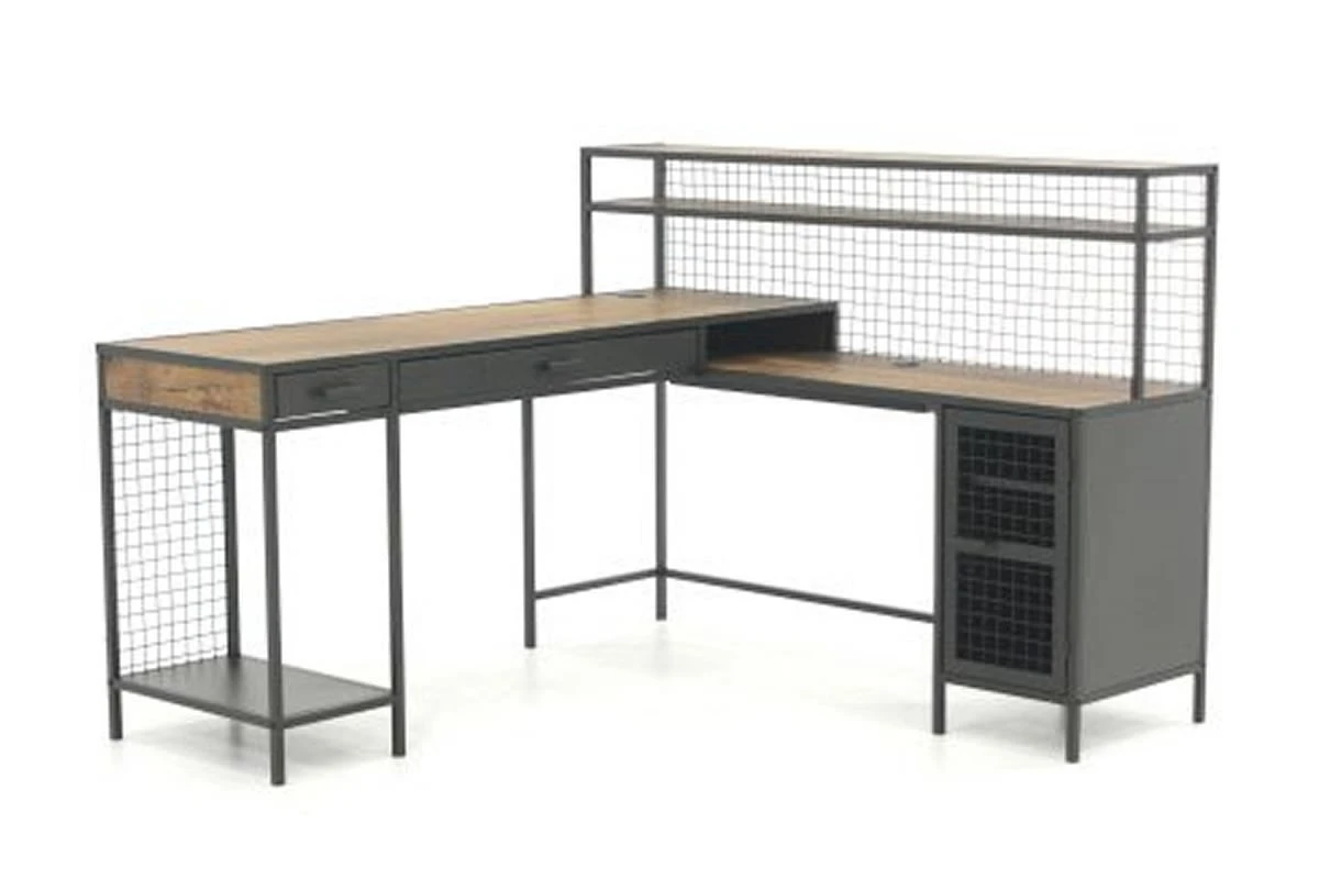 - Contemporary home office L-shaped desk in Vintage Oak finish and modern black accents