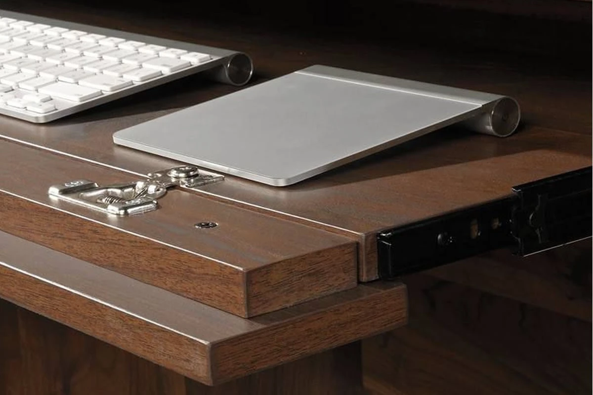 This mid-century-styled desk benefits from a large desktop working surface which provides more than ample space for writing and computer work. It also includes a flip-down slide-out keyboard/mouse shelf, two file drawers with full extension slides for holding letter-size hanging files as well as four storage drawers featuring metal runners with safety stops.