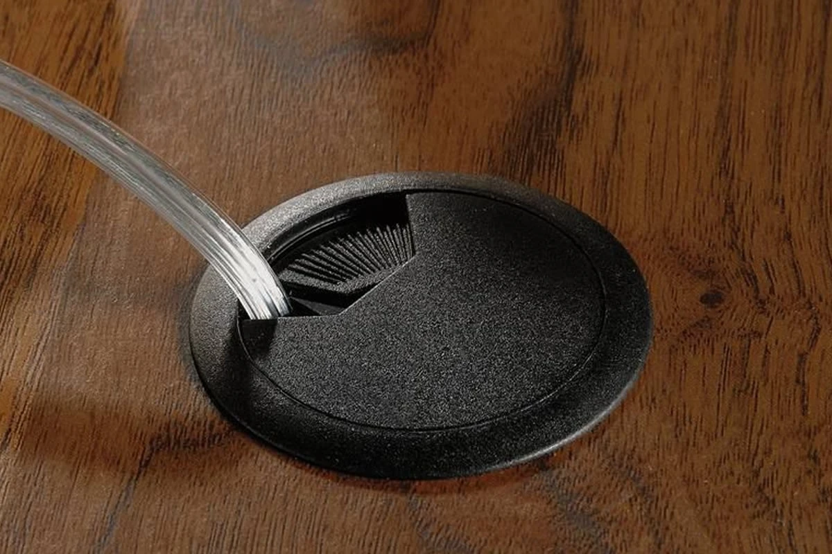 The desk top has grommet holes for electrical cord access to ensure you can wire up your necessary hardware in a neat and orderly fashion.