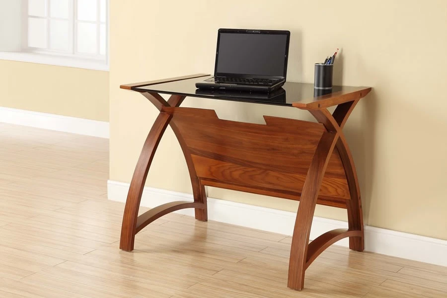 Discover the Curve, a laptop computer desk that combines style and functionality. The Curve features a unique design that showcases the beauty of natural wood and glass. You can choose from two different finishes: Walnut with Black Glass or Oak with Milky White Glass. You can also choose from two different sizes to suit your space and needs. The Curve is a laptop computer desk that will enhance your work experience and your home decor. The Curve is part of a matching furniture collection that will create a harmonious and elegant atmosphere in your home.