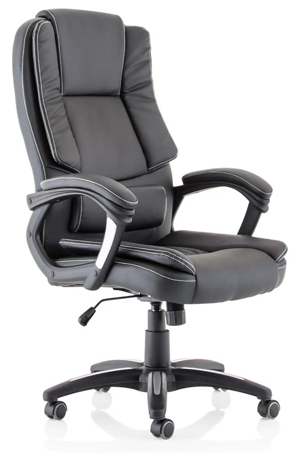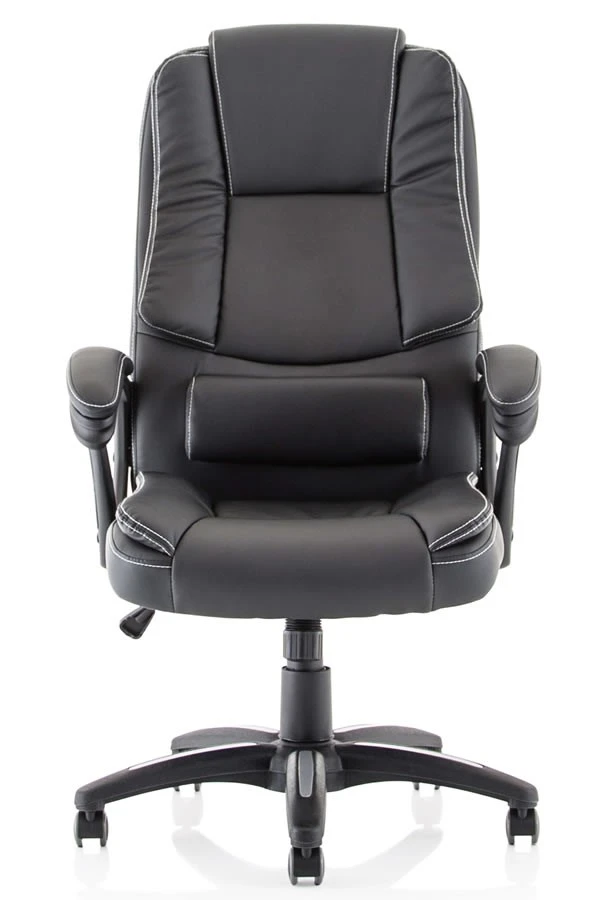 The Dakota over-sized high back executive faux leather chair in black features a luxury padded seat and backrest and deeply padded lumbar cushion.