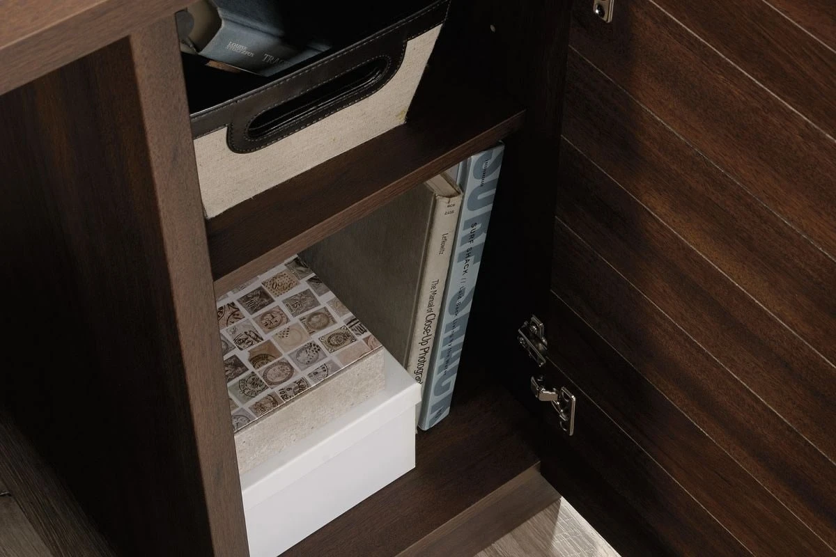 - Storage area behind door holds vertical CPU tower and features an adjustable shelf