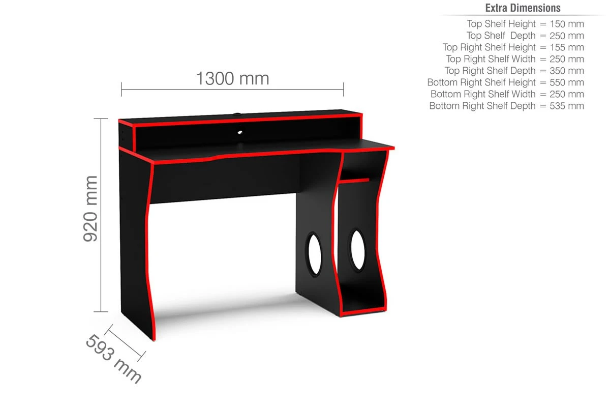 The Enzo gaming computer desk has been made with gamers fully in mind! It has everything a busy gamer could need. Featuring a large top shelf big enough for two large monitors and a generously sized ergonomic desk below suitable for the keyboard, mouse, controllers, games and more.
