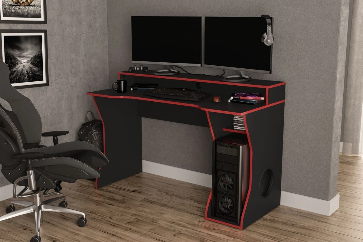 The base of the desk features a computer store away with a ventilation hole and small shelf for games or controllers. This modern looking gaming computer desk is finished in black with a dark red trim making it a stunning addition to any home or office.