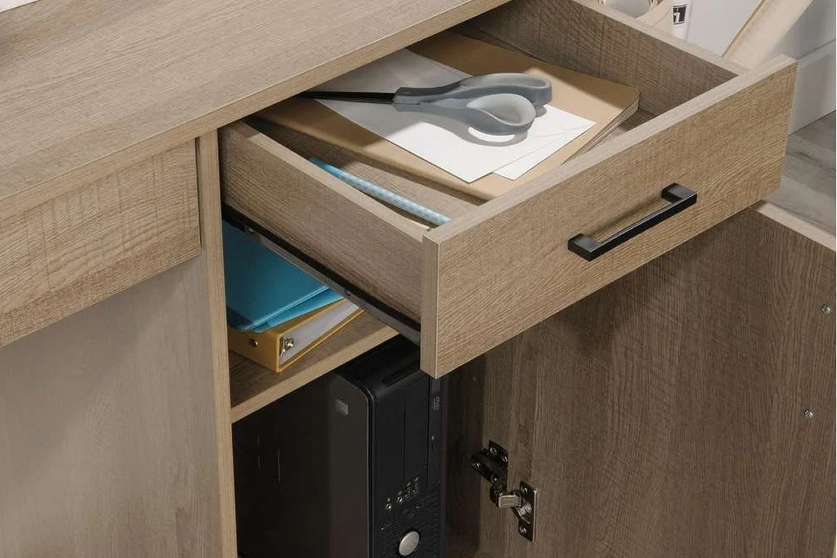 This item also features a hidden storage area behind the door that includes an adjustable shelf and accommodates a vertical CPU tower.