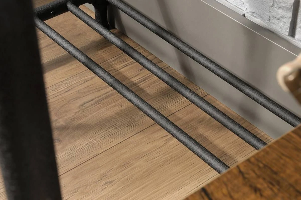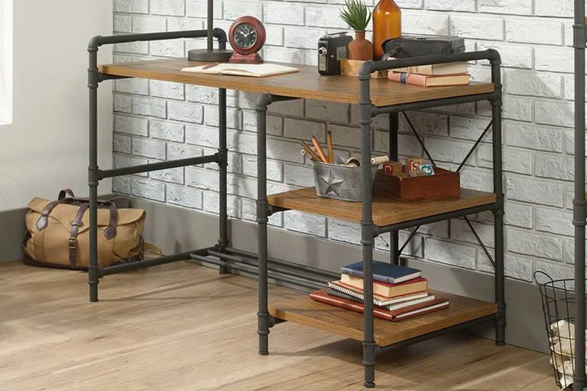 This durable yet sleek-looking desk provides a neat workspace for all manner of office studies. The neutral and sturdy textured powder-coated metal pipe framework brings a certain industrial chic to your work area and coupled with the checked oak effect 1″ thick desktop and matching storage shelves, you can ensure it’s a perfect and practical match for all rooms and colour schemes.