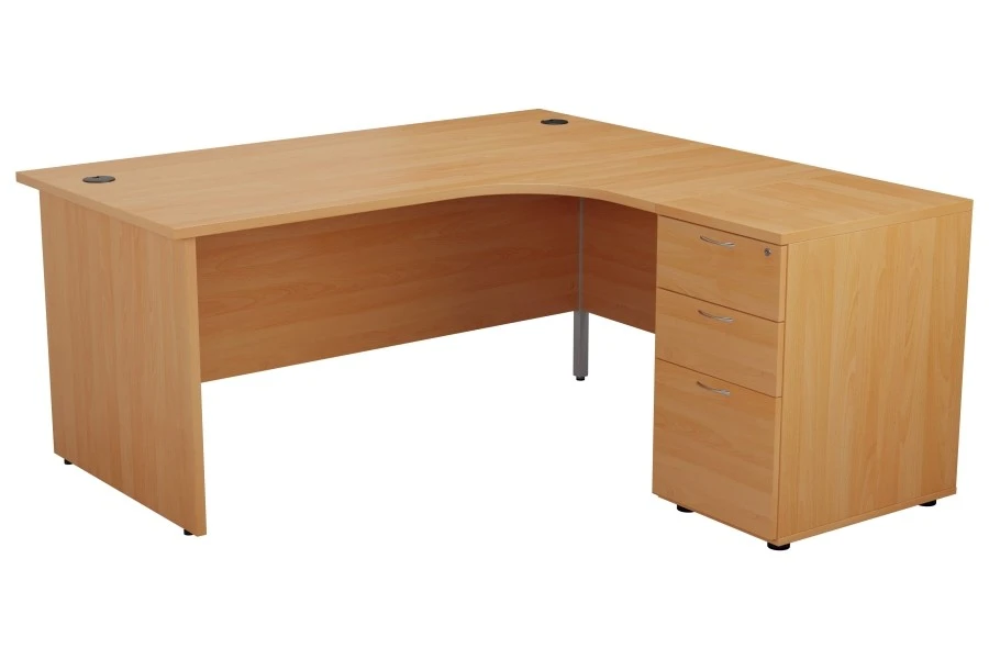 Whether you prefer beech or oak, the Kestral desk gives you the option to choose the colour and shape that suits you best. You can opt for either a left or right crescent and enjoy two internal cable ports for a tidy and organized work space. The panel legs on either end provide stability and support. The worktop is scratch-resistant and 25mm thick.