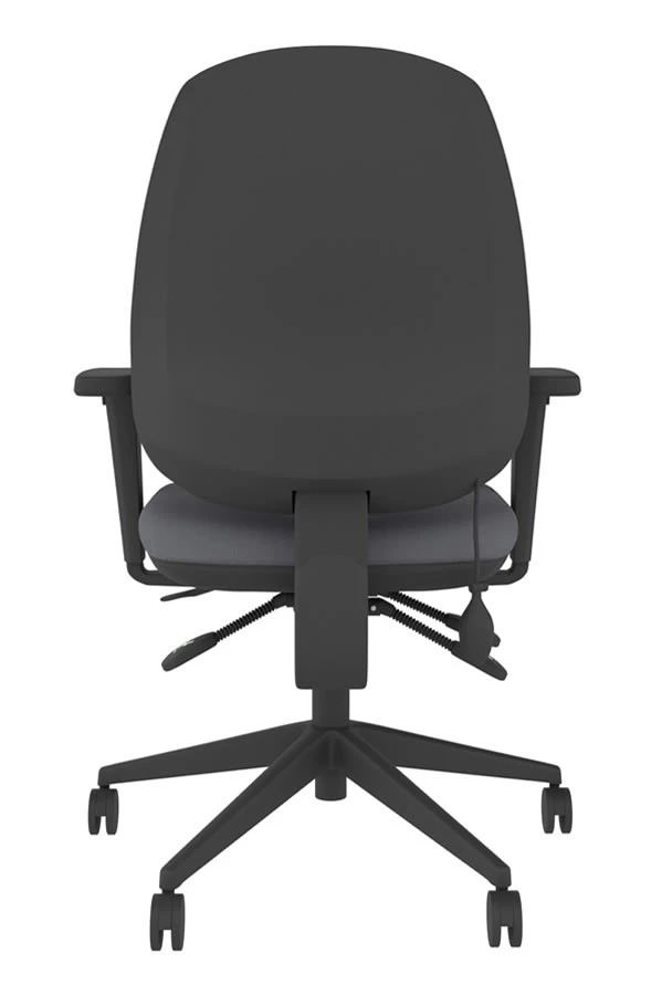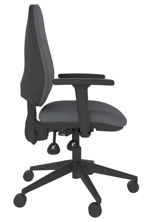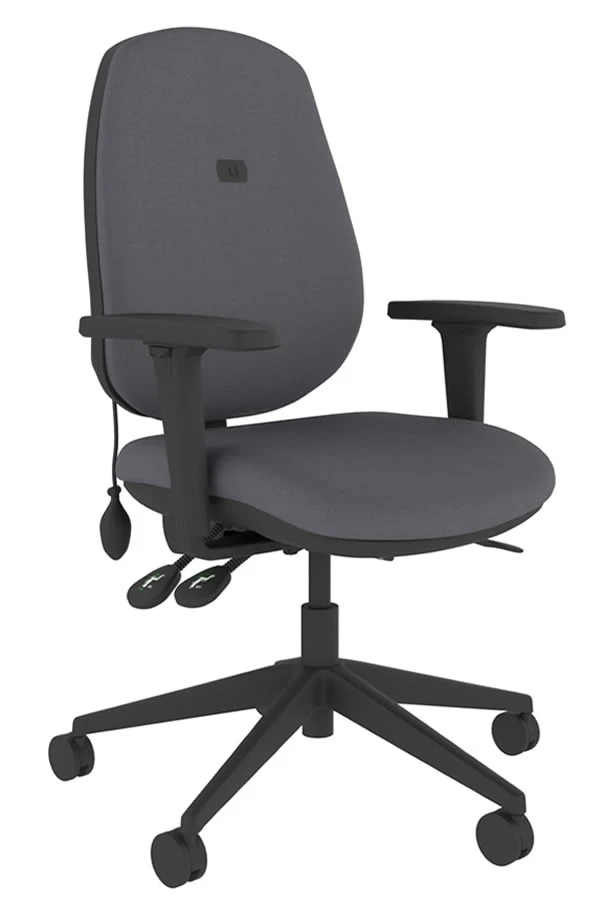 High back operator chair with 3 lever mechanism. The seat can be adjusted to angle tilt and slide forward to increase leg depth. Seat height adjustment and independent backrest adjustment and recline that can be locked in any position.