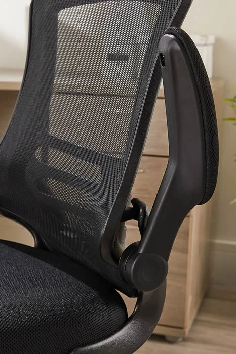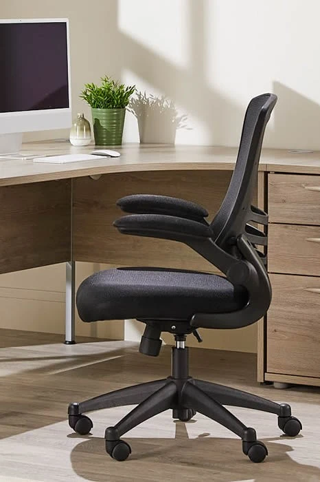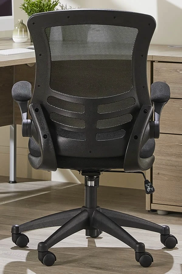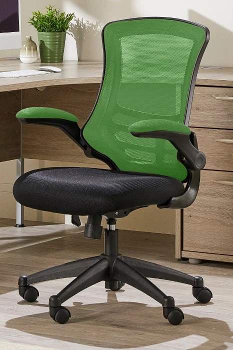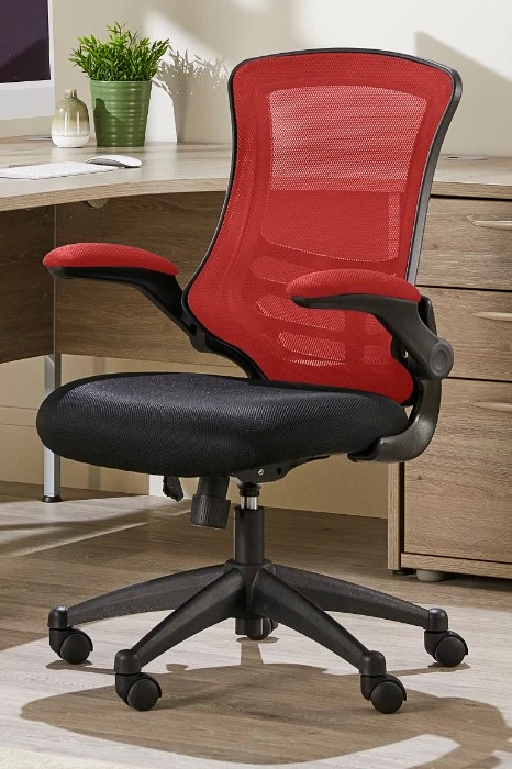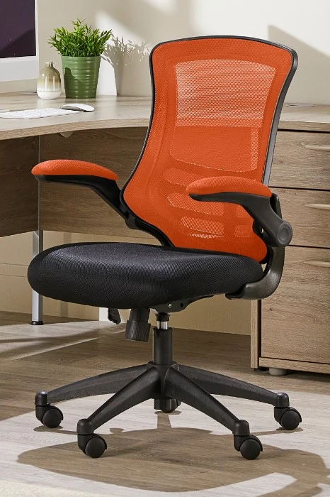 The Luna designer two tone mesh back office chair with folding arms is available in five colours. The operator chair has a tilt mechanism lockable in an upright position finished with an airflow mesh seat with a breathable mesh back.