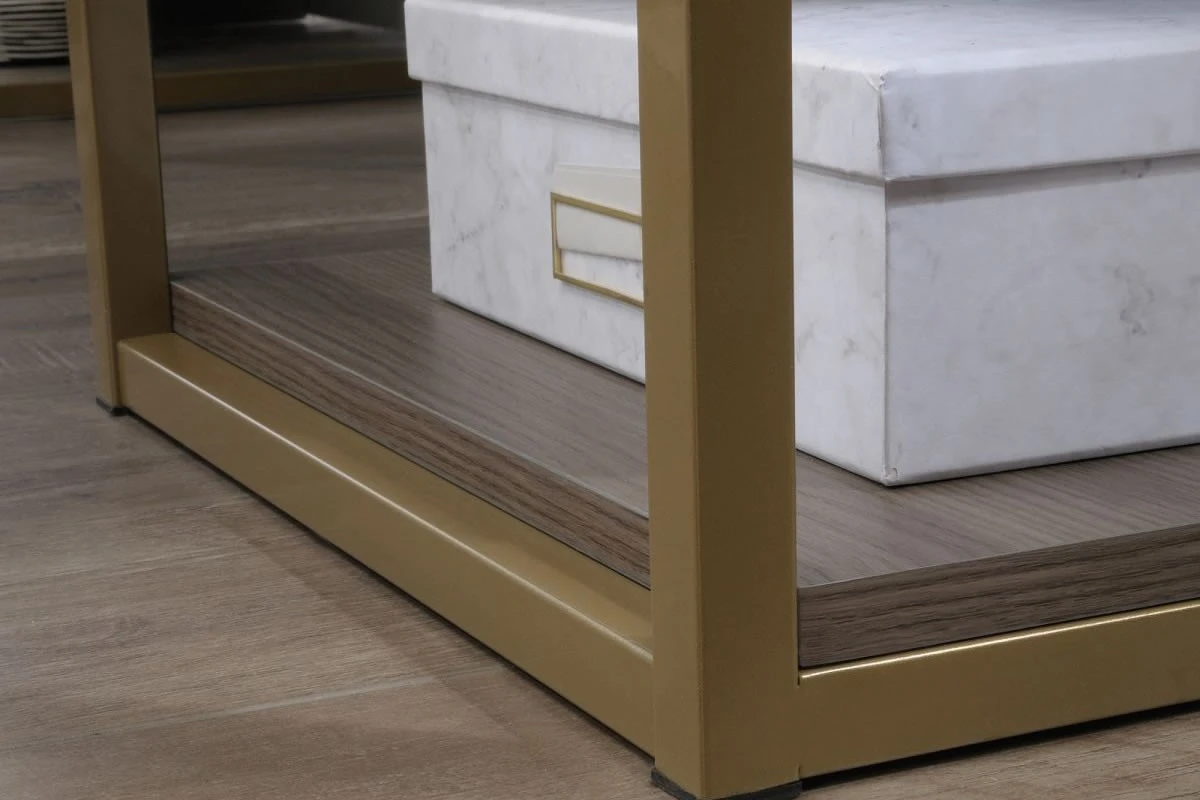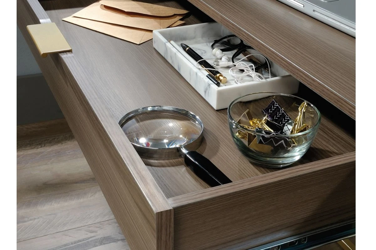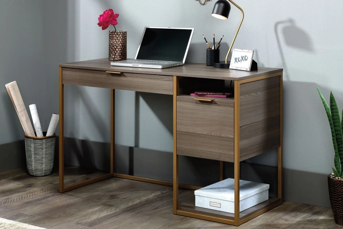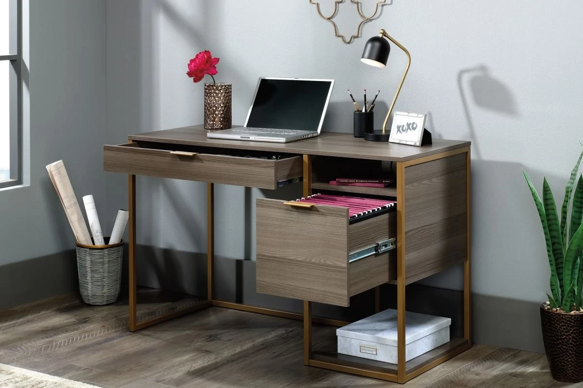 The desk is completed with a lower filing drawer with full extension slides which can hold letter or legal-size hanging files. The light brown durable powder-coated metal frame complements the Diamond Ash finish perfectly, ensuring it’s an ideal and seamless match for all rooms and colour schemes.