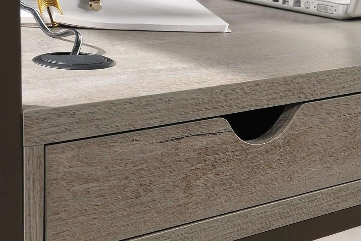 This L-shaped desk features an elevated shelf with cubbyhole storage which allows easy access to all of your office accessories. There is also a discreet stationery drawer with metal runners and safety stops for your convenience as well as a flip-down panel for concealed storage located at the back of the desk.