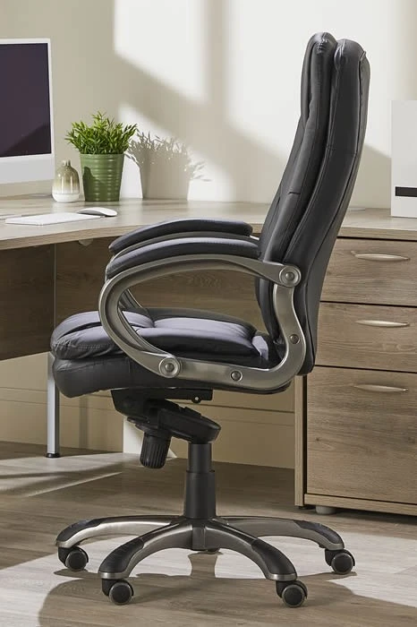 The black leather is complemented perfectly with a gunmetal grey finished frame, along with padded armrests for additional comfort. The chair is then supported on a robust five-star base, while the castors allow the chair to glide effortlessly across any surface.
