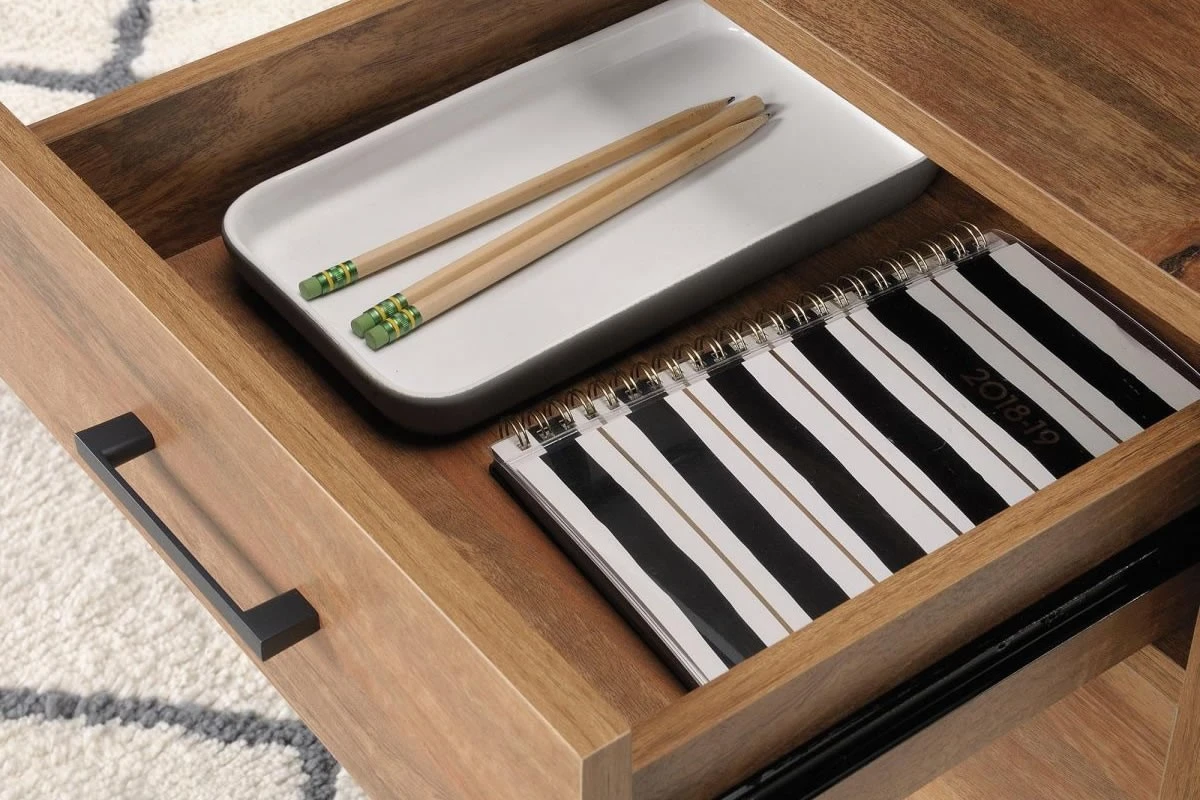 The large desktop and return provide a generous working area for all types of work and the two drawers on full extension slides are perfect for discreetly keeping all of your pens, pads and other office accessories neatly hidden. The lower drawer can also hold letter-size hanging files. There is also a small open cubby shelf for books and other study items. It also has the added benefit of being finished 360 degrees for multiple placements within your room. All in all, a fabulous solution for all your home office needs.