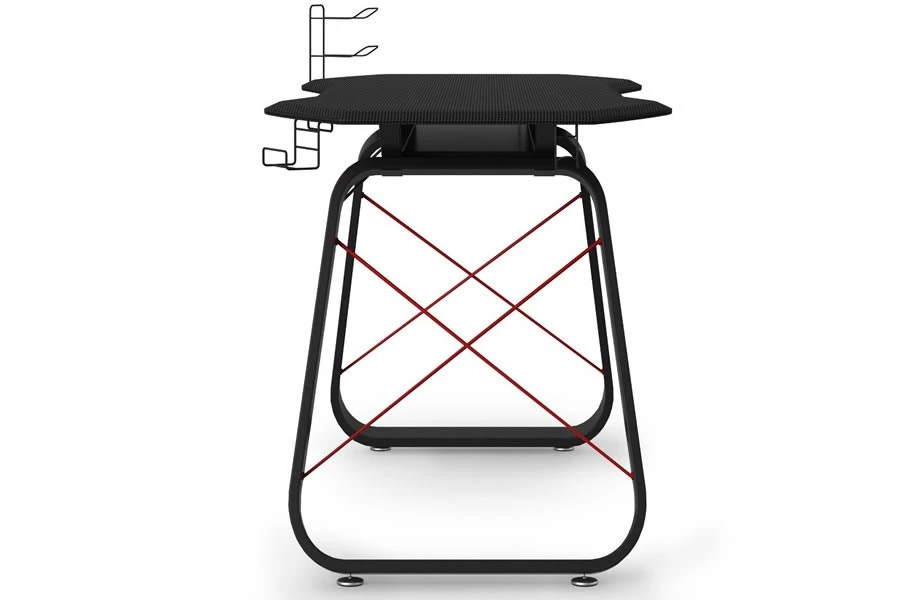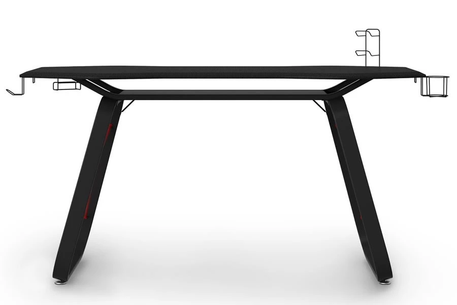 The modern stylish design has a carbon fiber looking desk top surface with curved front to give an ergonomic feel and cut outs at the back to make cable management easy.